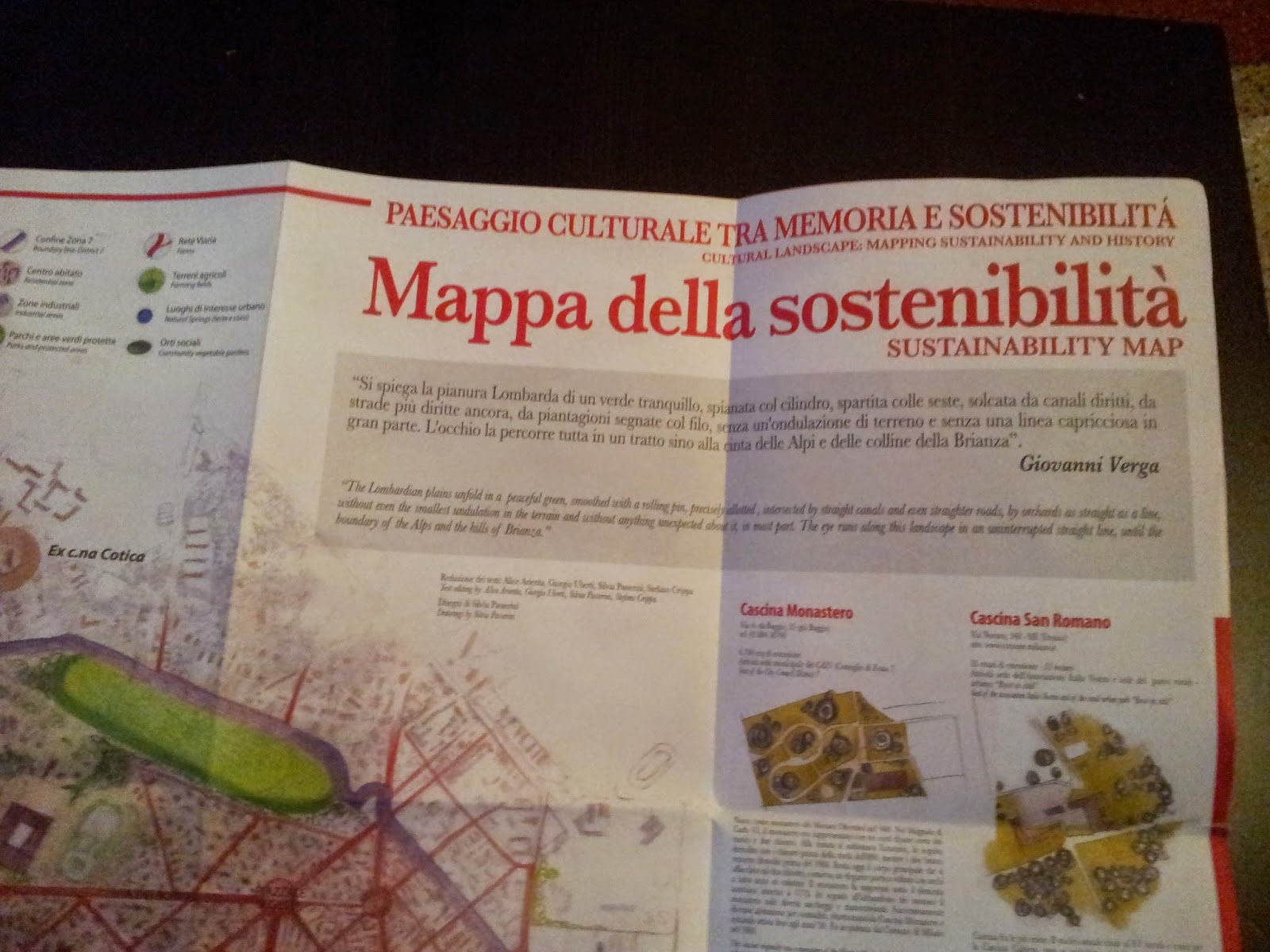 Accanto alla cartina double face, c’è anche un opuscolo illustrativo, che raccoglie e spiega le molte cose che le mappe non potevano contenere. E’ anche spiegato in diverse pagine illustrate da fotografie, in che cosa consiste la campagna milanese, quali sono i sui pregi e le sue unicità.