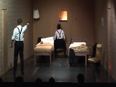Fabrizio Martorelli è Gus, Alberto Onofrietti è Ben, due interpreti noti, di cui la Milano del teatro non può che essere grata e orgogliosa. Gus e Ben sono due nomi e ruoli altamente intercambiabili, potrebbero essere due giovani come due anziani, recitano battute complementari, i veri “camerieri scemi” e i protagonisti inquietanti sono loro, imprigionati nell’incapacità di uscire dall’ambiente claustofobico in cui si sono cacciati.