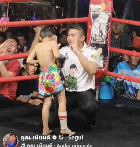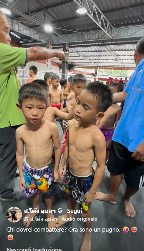 In un drammatico video, tolto da Facebook, due bambini dell’età apparente di tre anni, un maschio e una femmina, vengono costretti a combattere fra loro sul ring. Il maschietto ha la peggio, piange, l’istruttore, autentico squalo, lo minaccia con un rametto per farlo rialzare e riprendere il combattimento; al piccolo manca il fiato, viene costretto ugualmente a battersi, lì accanto c’è quella che presumibilmente è la madre, comunque una persona molto famigliare, che lo spinge a rialzarsi e continuare a combattere. La bambina è chiaramente più forte lo calcia duramente e lo sbatte a terra più volte; il bimbo, che piange dal dolore, cade molte volte, nessuno interviene a far cessare questo indegno massacro. Anzi, più lontano c’è una figura maschile, forse il padre, se ne sta bellamente seduto. I commenti in thailandese, con la traduzione automatica, sono tutti un’elogio per la bambina “futura campionessa”. A questo punto è chiaro: il bimbo serve ad allenare la bambina palesemente più abile, è dato “in pasto” al combattimento, probabilmente con un compenso allungato ai genitori. Il bimbo rischia seriamente di vedere compromessa la sua salute mentale e fisica.