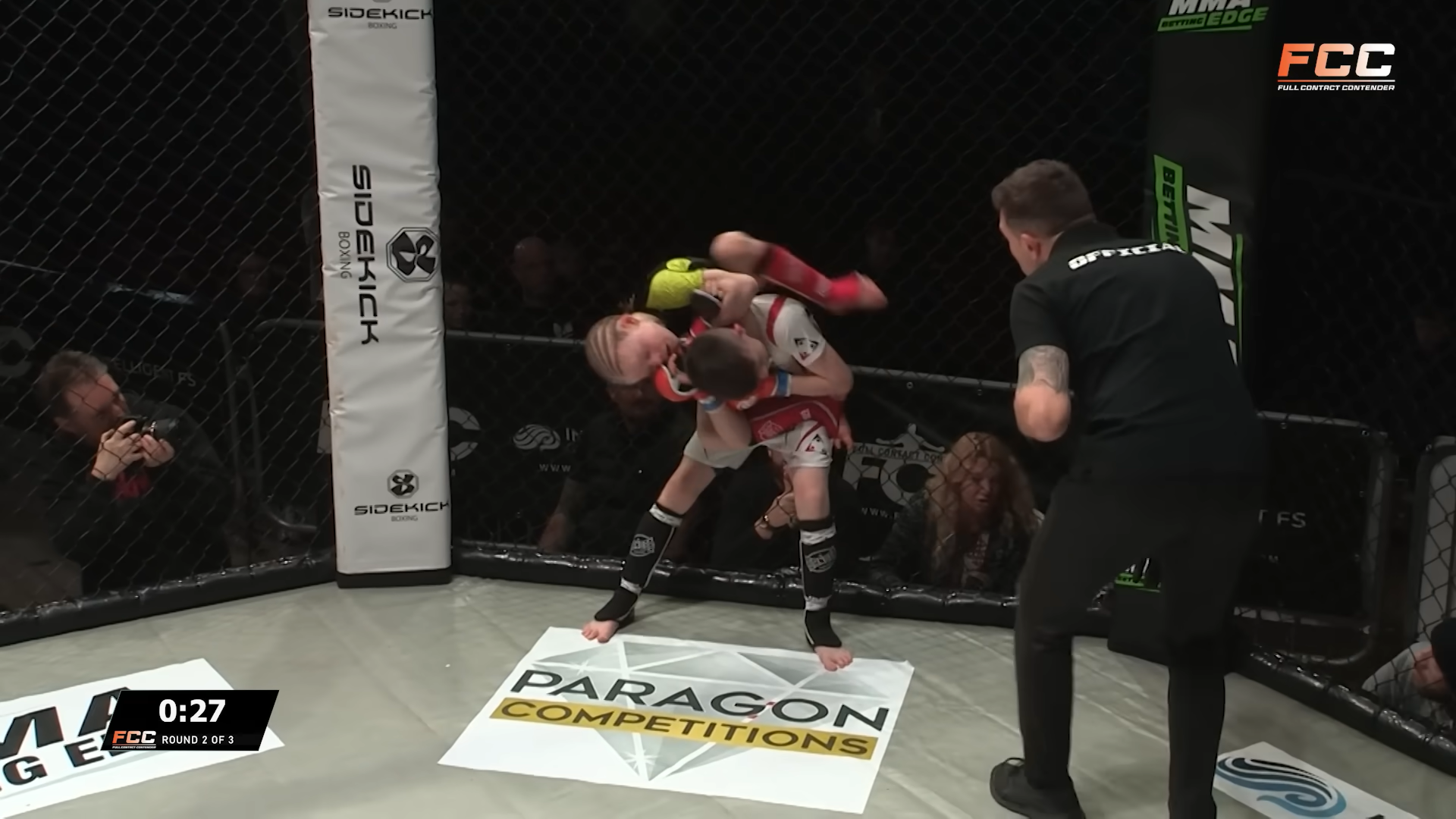 Come gli adulti. Un bimbo combattente fisicamente esile “contato” dall’arbitro dopo essere stato fatto oggetto di vari colpi